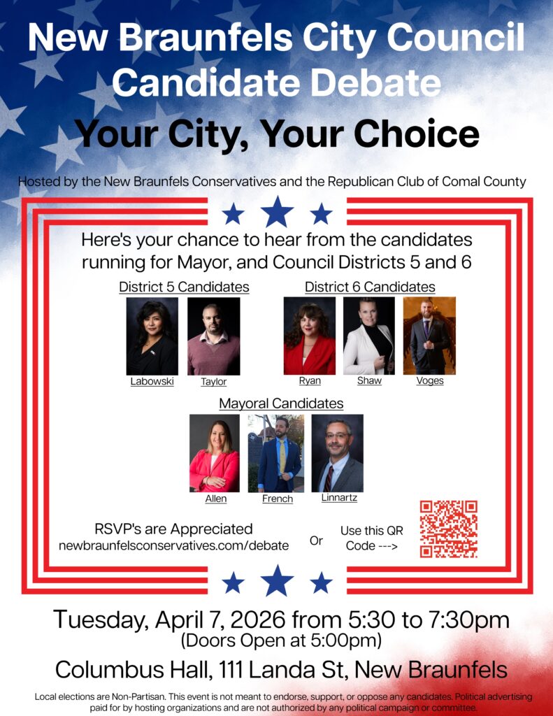 Thank you for your interest in the 2026 New Braunfels City Council Debate and Forum. If you’d like to attend, please click on the link below to RSVP for the event. No obligation, no cost. We just need to get an idea of how many people are coming.